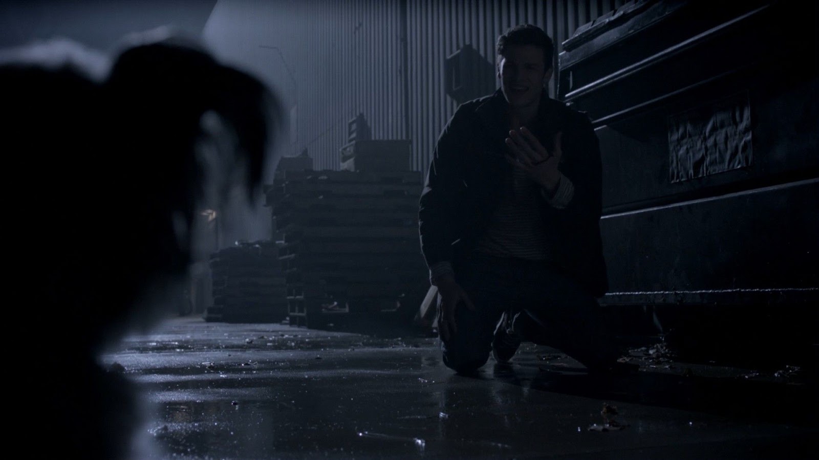 Meanwhile, outside in the parking lot, Bullet gets scared and runs away from Kyle before he can be loaded into the car. The exasperated owner chases the little guy around in a dark alley for a few minutes, until he finally hears barking nearby, which leads him to assume that Bullet is hiding under a dumpster. He crouches down to reach under it and grab his pup, but when he reaches his arm out, something snaps at him, nipping at his hand and causing enough pain that he immediately jerks his arm backward like he was burned. What the fuck were you thinking, Kyle? You live in Beacon Hills! Don't go into dark alleys!